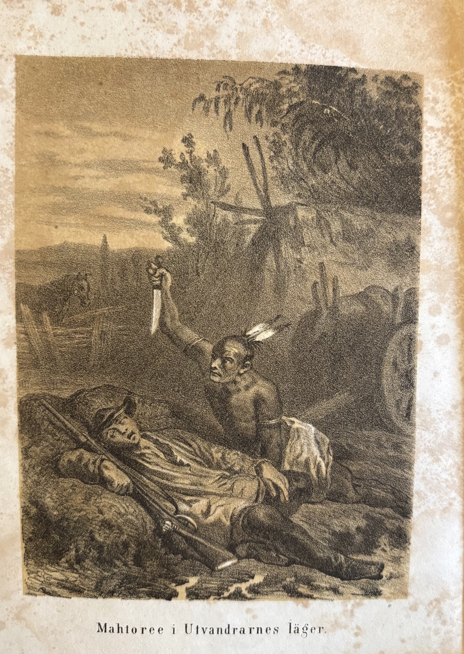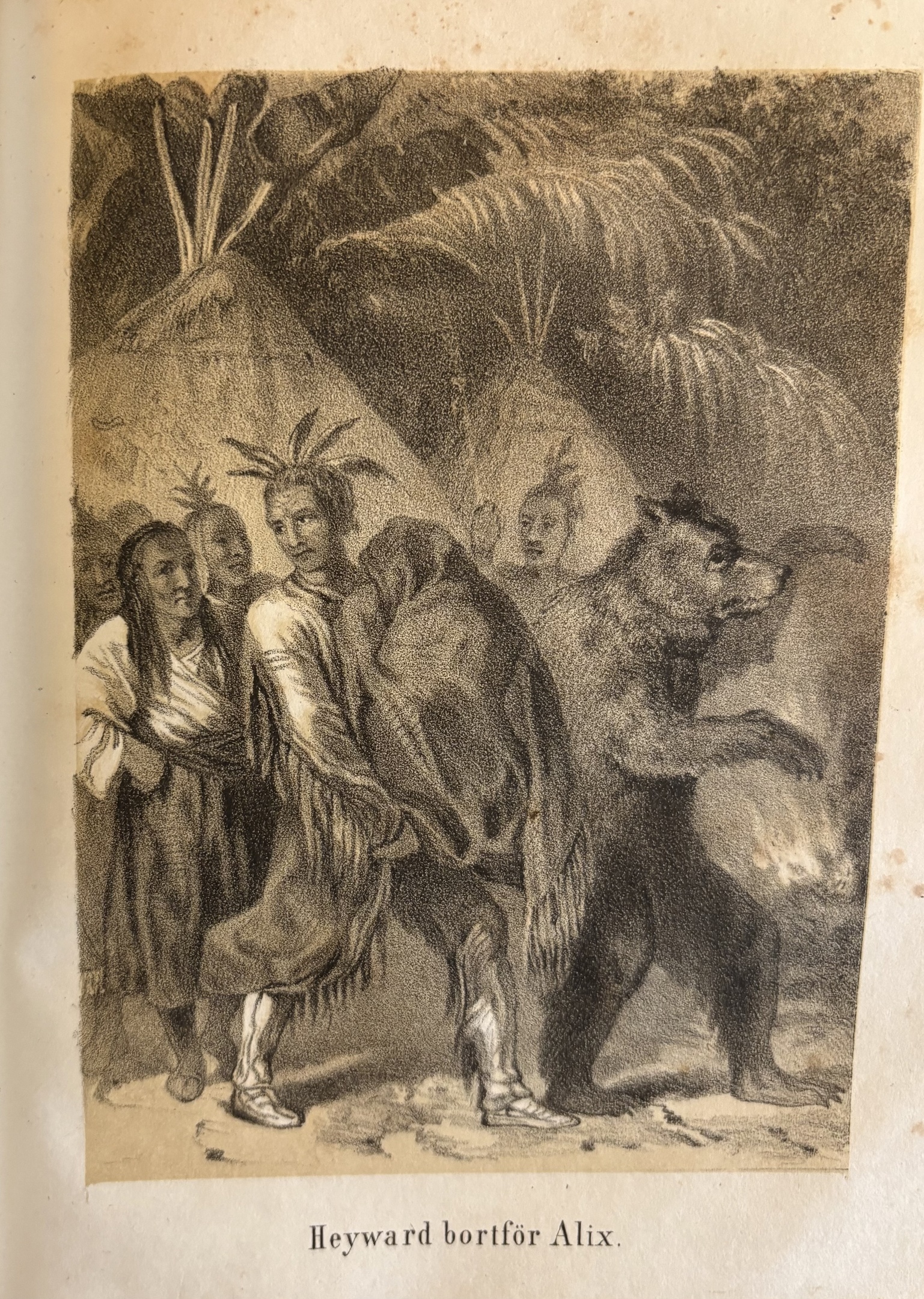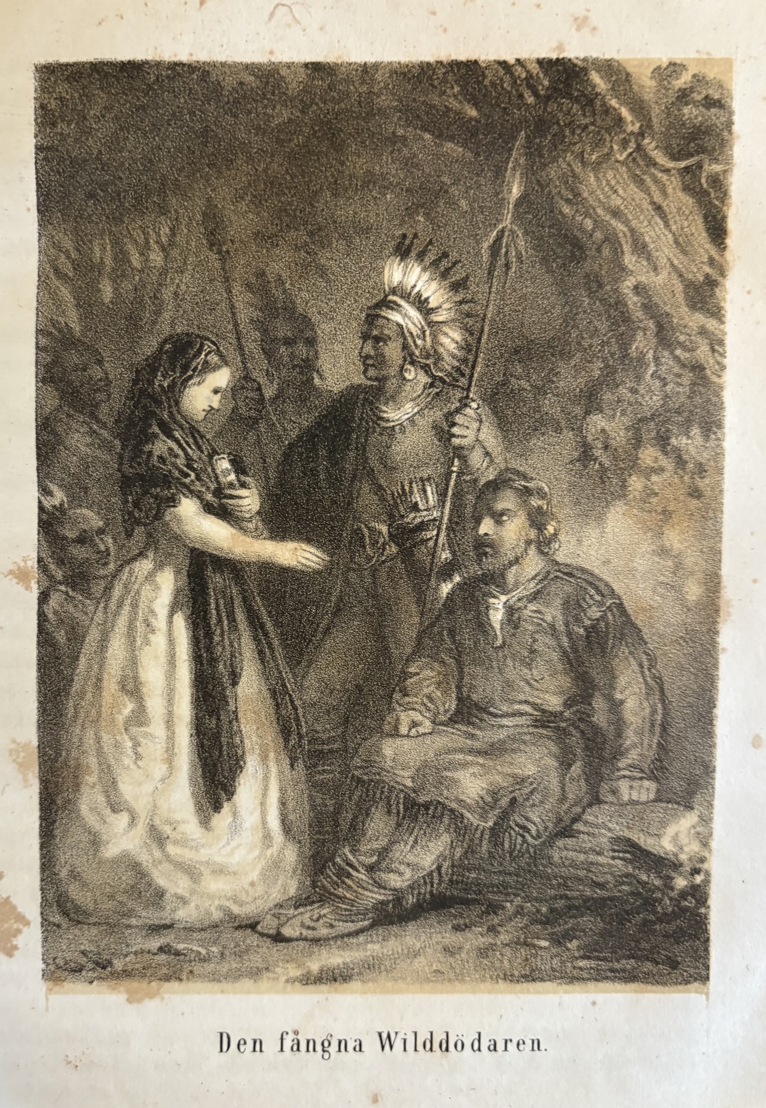 Denne har jämte en vit flicka, Klara, tagits till fånga av indianer.