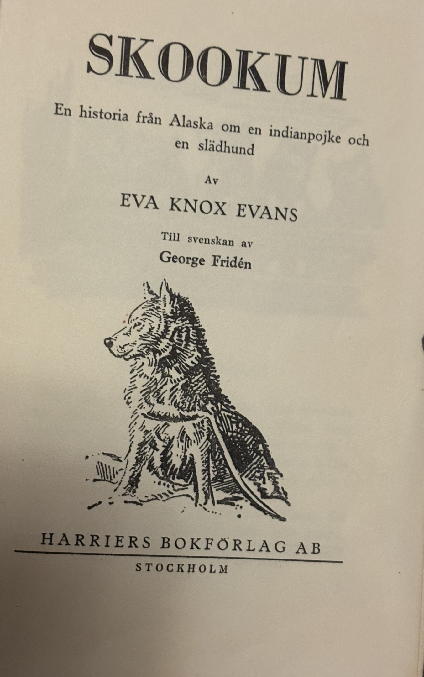 Skookum : en historia från Alaska om en indianpojke och en slädhund / Till svenskan av George Fridén. - Stockholm : Harrier, 1949. - 68 s, : ill.